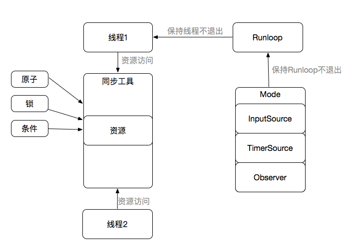 因为在主线程执行耗时操作会影响用户体验 -----> 所以我们得需要使用多线程技术(子线程)-----> 由于子线程在执行一次之后就会退出,所以我们的使用Runloop(Runloop的保活又需要使用Mode) -----> 由于多线程在资源争夺方面的问题 -----> 我们得使用锁 -----> 由于使用多个锁的时候会造成死锁或者活动锁 -----> 所以我们在同一时刻最好的办法就是只用一个锁。